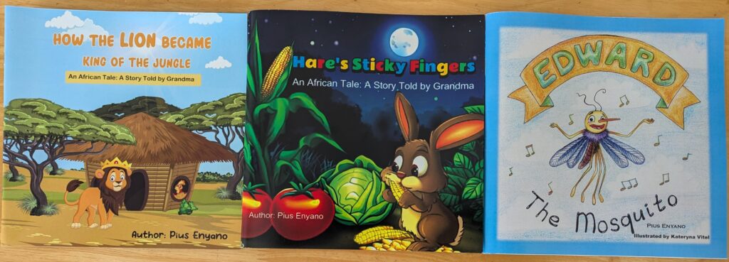 As a child in Uganda, Pius sat around the bonfire late in the evening as his grandparents shared African folktales. He decided to extract some of those stories from his mind and put them on paper. So, How the Lion Became King of the Jungle and Hare’s Sticky Fingers were brought to life in colorful picture books authored, edited, and published by Pius and Hilary Enyano. His newest book, Edward the Mosquito, is a character created by him that delights children of all ages.